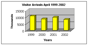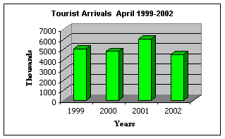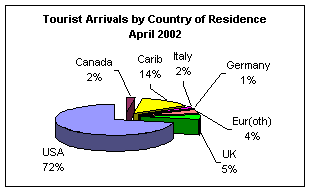 January to April saw a decline of 6.2% in visitor arrivals for the period 2001/2002. When comparing the first four months of 2000(post hurricane Lenny) which saw 30,910 arrivals with the same period for 2002, (post September 11) arrivals increased by 10% or 33,959 arrivals.