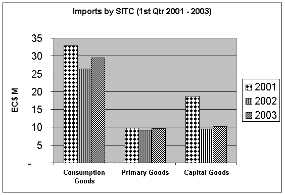 Food products, beverages and tobacco, machinery and transport equipment (trucks), were some of the major contributors to the increase for this period. For the 1st quarter 2003, EC$3.0 million more in Consumption Goods were imported than in the previous year, which amounted to a 12% increase in this category when compared to 2002. Capital goods increased by 7% and primary goods also increased by 5% for this period compared to the 1st quarter 2002.