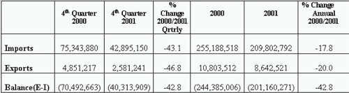 October and December both showed a 36% decline in imports, while November had a 52% decline. Overall, total merchandise imports for the 4th quarter ending December 2001 were EC$43 million. This represents a 43% decline over the same period in 2000, whilst the annual merchandise imports was EC$210 million, a 17.8% decline when compared to 2000 when EC$255 million was recorded in merchandise imports. The larger decline during the last quarter can possibly be attributed to, the disruption in air traffic due to September 11, plus the lower expected demand by tourists.